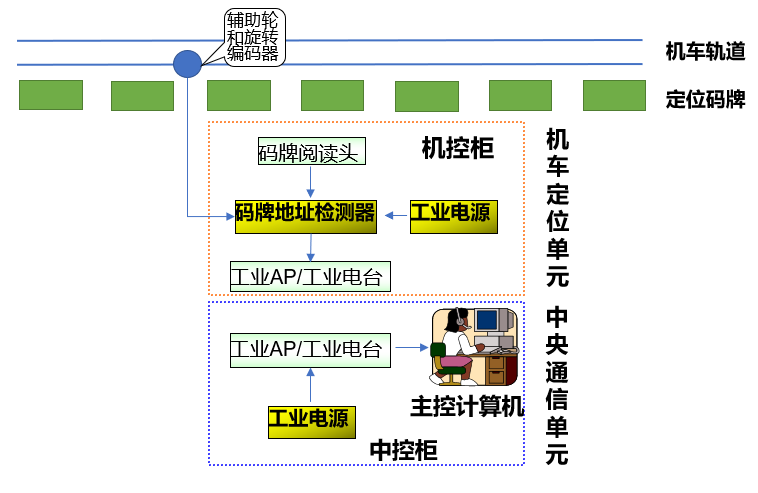 2、機車定位單元:工業電源,碼牌閱讀頭,輔助輪,絕對值旋轉編碼器,碼牌地址檢測器,工業數傳電臺或工業AP。