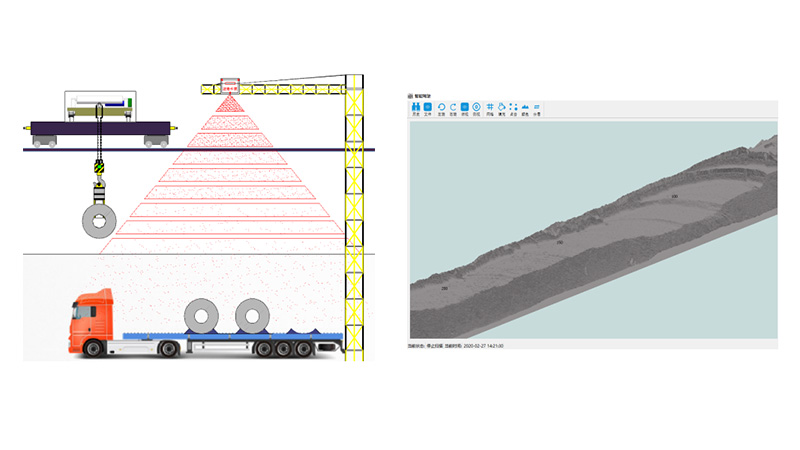 三維掃描是利用激光掃描、視覺成像、高精度云臺等技術獲取料堆或汽車的輪廓,生成物料的三維坐標,指導天車精準作業。應用場景有汽車掃描識別、料堆成像。